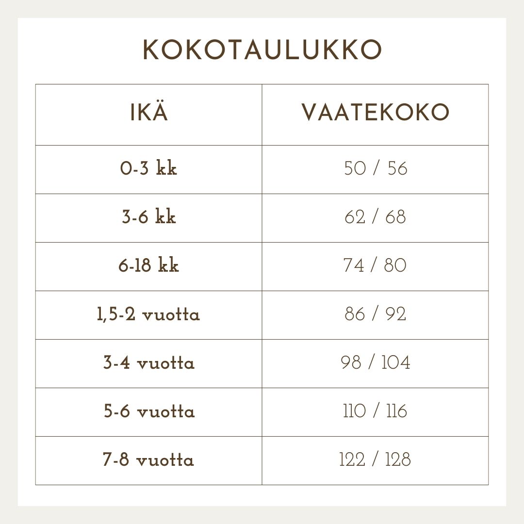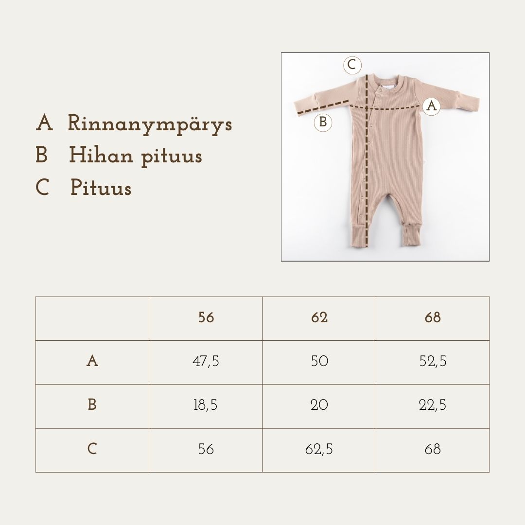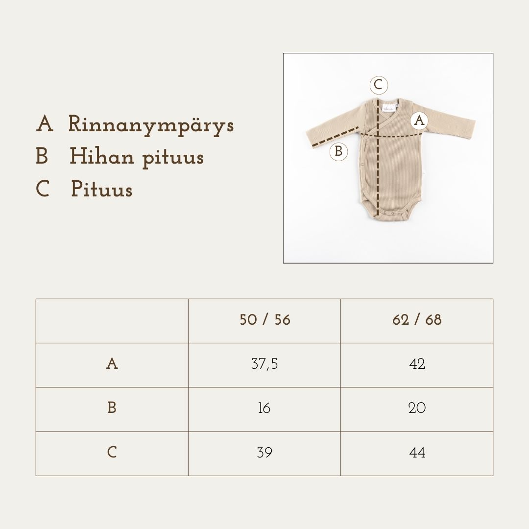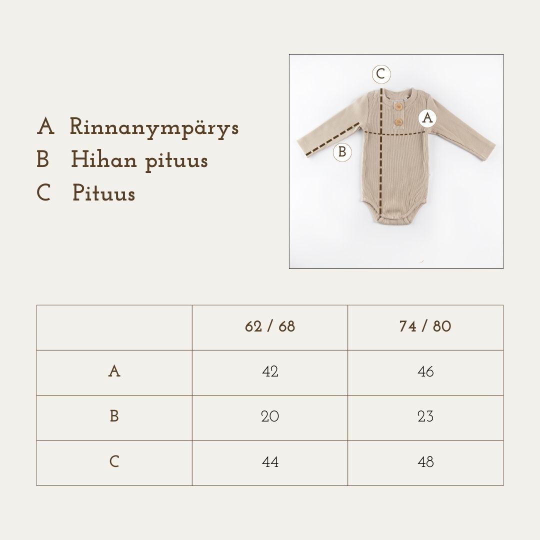 Alta löydät tuotteiden mitat. Vaatteet joissa käytetään kaksoiskokoa on mitoitettu suuremman koon mukaan, joten tuotteissa on pitkä käyttöikä. Bodyissa on käytössä myös kaksoisnepparit haaraosassa, joten niillä voi pidentää bodyn pituutta vauvan kasvaessa. Koska tuotteemme tehdään käsitöinä, voi mitoissa esiintyä pieniä heittoja. Jos haluat lisätietoja kokomerkinnöistä, vastaamme mielellämme kysymyksiisi.