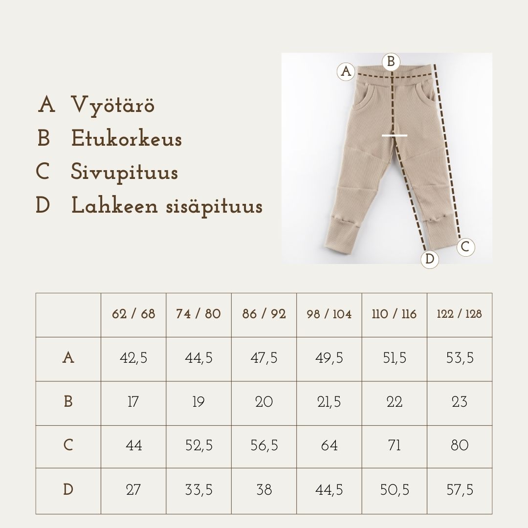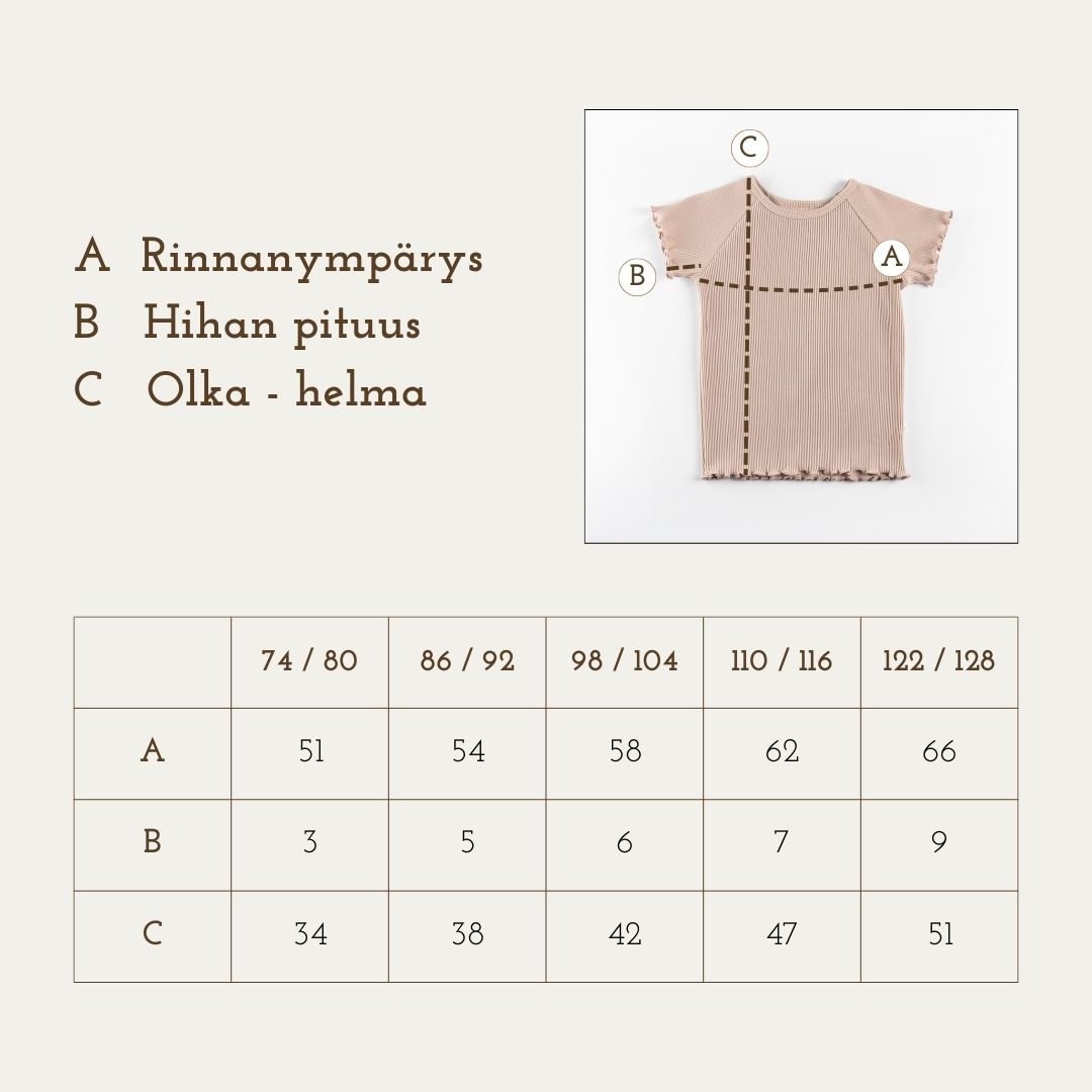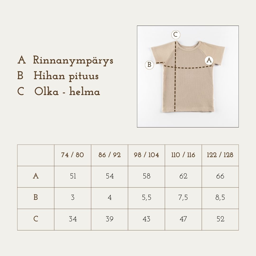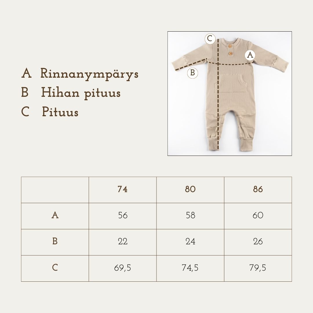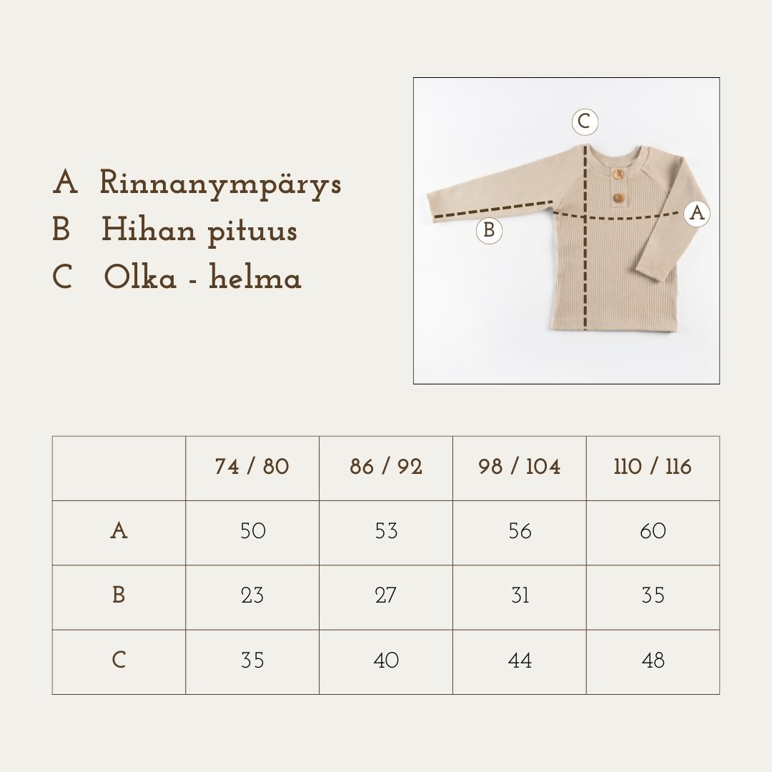 Alta löydät tuotteiden mitat. Vaatteet joissa käytetään kaksoiskokoa on mitoitettu suuremman koon mukaan, joten tuotteissa on pitkä käyttöikä. Bodyissa on käytössä myös kaksoisnepparit haaraosassa, joten niillä voi pidentää bodyn pituutta vauvan kasvaessa. Koska tuotteemme tehdään käsitöinä, voi mitoissa esiintyä pieniä heittoja. Jos haluat lisätietoja kokomerkinnöistä, vastaamme mielellämme kysymyksiisi.