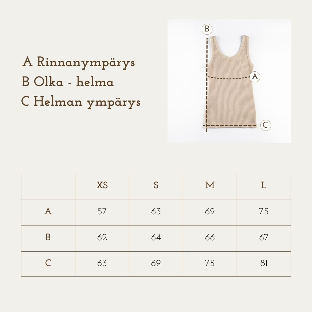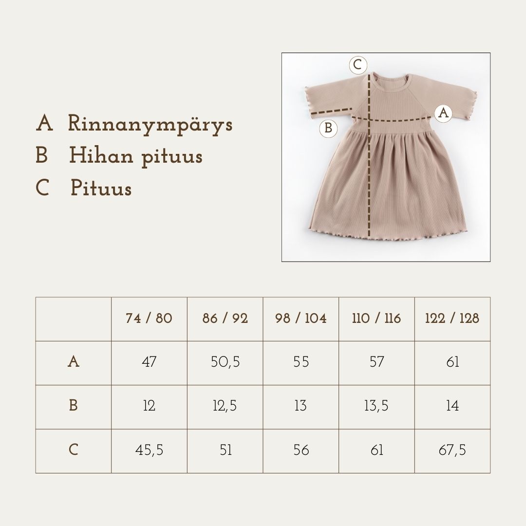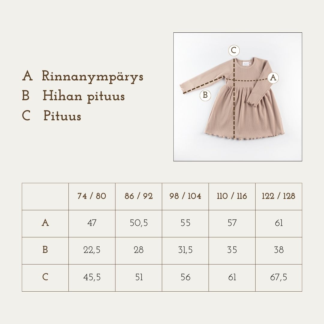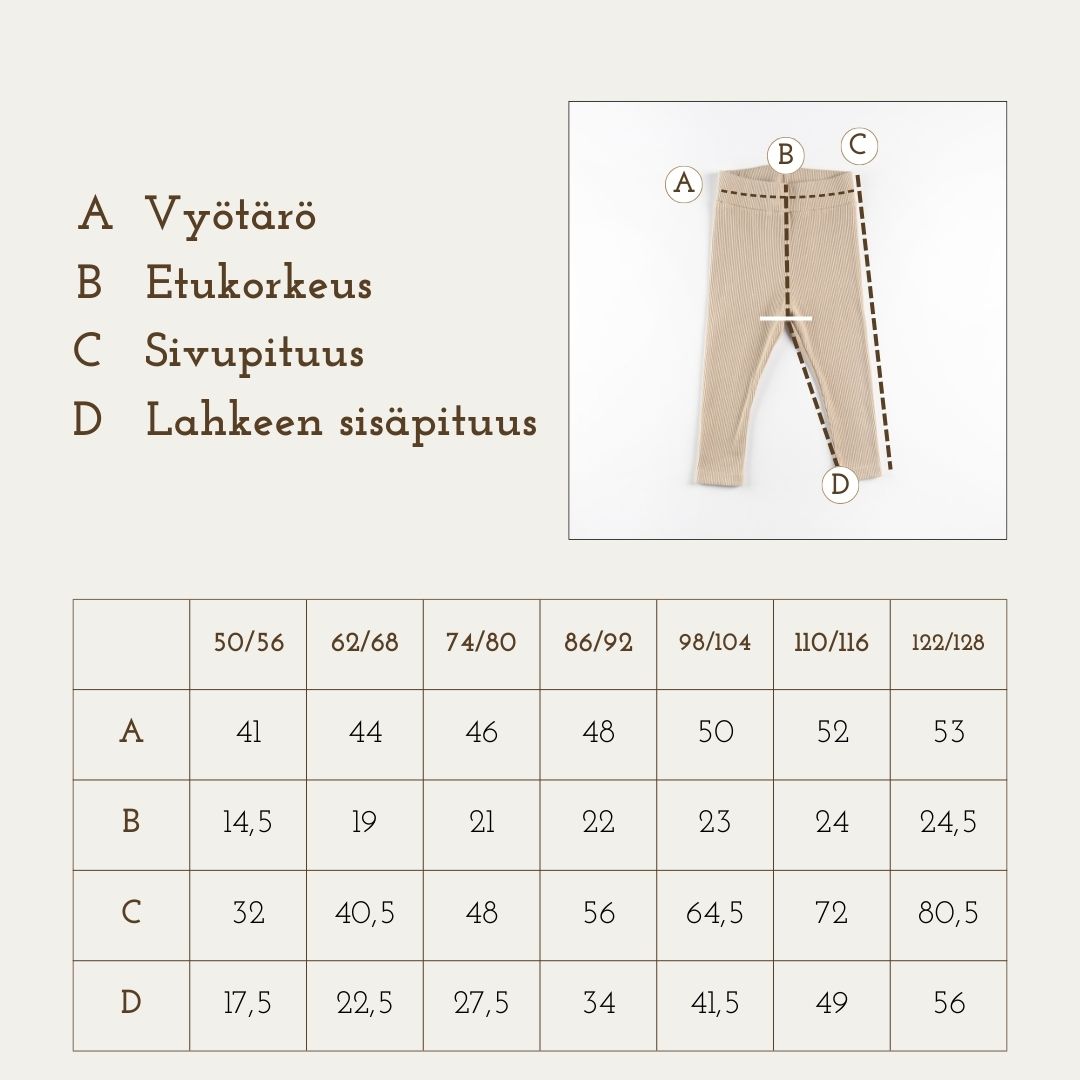 Alta löydät tuotteiden mitat. Vaatteet joissa käytetään kaksoiskokoa on mitoitettu suuremman koon mukaan, joten tuotteissa on pitkä käyttöikä. Bodyissa on käytössä myös kaksoisnepparit haaraosassa, joten niillä voi pidentää bodyn pituutta vauvan kasvaessa. Koska tuotteemme tehdään käsitöinä, voi mitoissa esiintyä pieniä heittoja. Jos haluat lisätietoja kokomerkinnöistä, vastaamme mielellämme kysymyksiisi.
